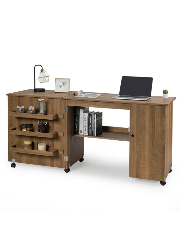 Gymax Folding Sewing Craft Table Shelf Storage Cabinet Home Furniture W Wheels Brown Walmart Com