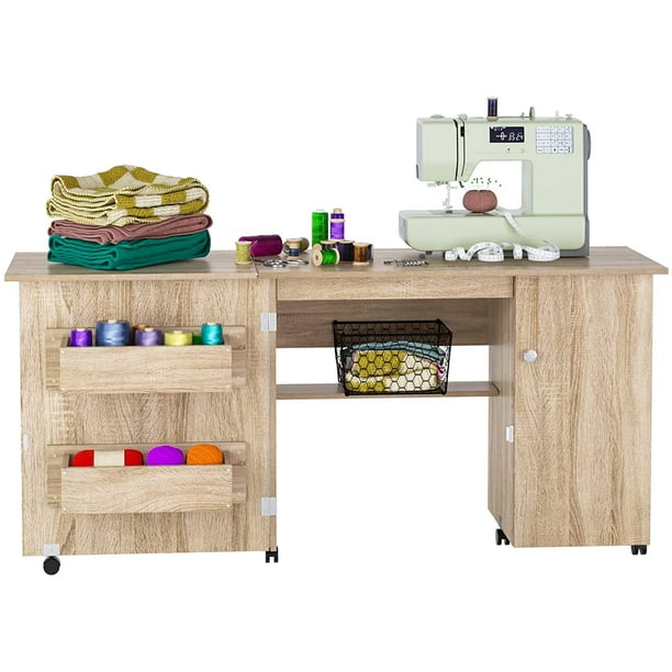 Cinak 63 Inches Folding Sewing Machine Table With Storage Space Large Table With Cabinet Sewing Desk With Wheels With Lock Oak Walmart Com